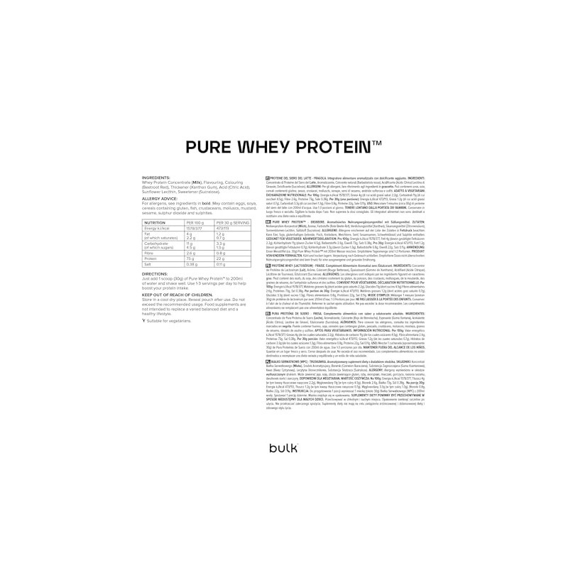 Bulk Pure Whey Protein ist ein Molkenprotein-Konzentrat, das im Vereinigten Königreich intern hergestellt wird und zu beeindruckenden 80% aus reinem Molkenprotein besteht. Dieses Molkenprotein-Pulver wird zum einfachen Mischen instantisiert und ist die ideale Nahrungsergänzung nach dem Training. Es trägt zum Muskelaufbau und zum Erhalt der Muskelmasse bei. Es ist vollgepackt mit essentiellen Aminosäuren wie BCAA und Glutamin und eignet sich perfekt für alle, die ihre Proteinaufnahme erhöhen möchten und gleichzeitig eine gesunde, ausgewogene Ernährung wünschen. Erhältlich in einer breiten Palette von köstlichen Geschmacksrichtungen.