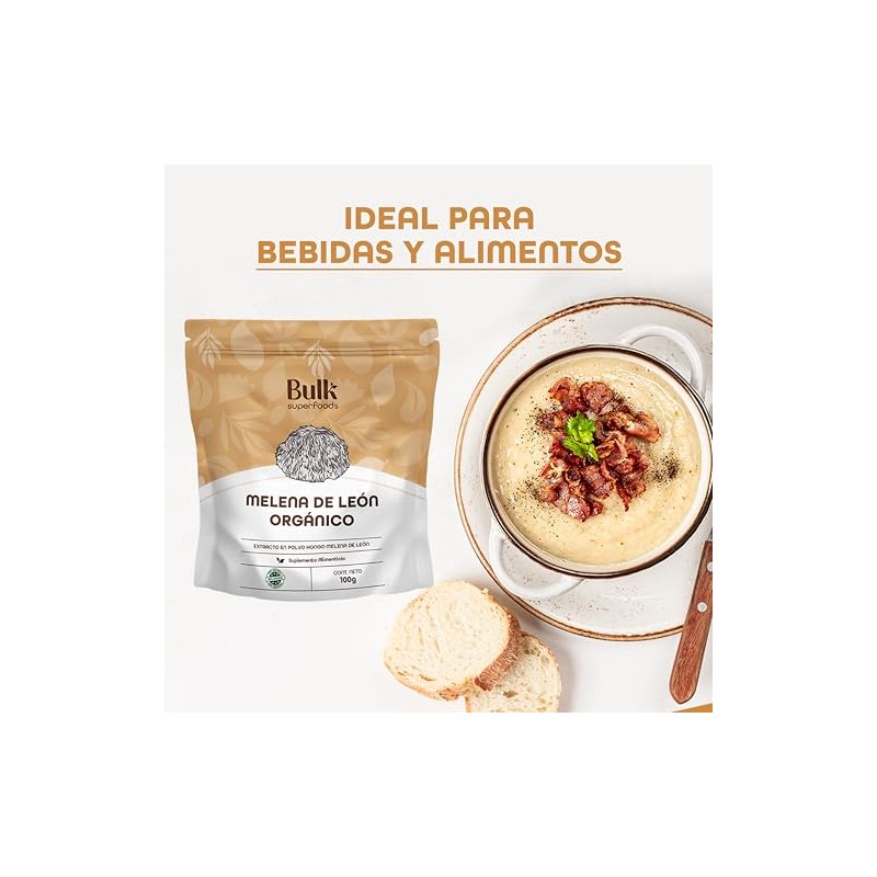 Acerca de este artículo ORGÁNICO Y NATURAL | Hecho con extracto puro de hongo Melena de León en polvo, perfecto para complementar tu dieta de forma natural y saludable. EXTRACTO EN POLVO | Fácil de disolver en bebidas como café, té o smoothies, o en alimentos, para una integración sencilla en tu rutina diaria PRÁCTICO Y RENDIDOR | Con un scoop incluido, cada paquete de 100 g ofrece múltiples porciones, permitiéndote dosificar de 1 a 2 veces al día según tus necesidades. CALIDAD SUPERIOR | Producto 100% natural y a granel, procesado con estándares de calidad para garantizar pureza y efectividad BULK SUPERFOODS | Somos una Marca de Alimentos 100% Naturales y Orgánicos. Tomamos lo mejor de la naturaleza para llevarte productos únicos, saludables y deliciosos que aporten una nutrición consciente y beneficios a tu día a día. Elige entre mas de 20 productos pensados especialmente para ti, incluyendo cápsulas, suplementos alimenticios, harinas, endulzantes, quínoa entre muchísimos otros. Visita nuestra tienda, ¡estamos seguros de que te encantara!