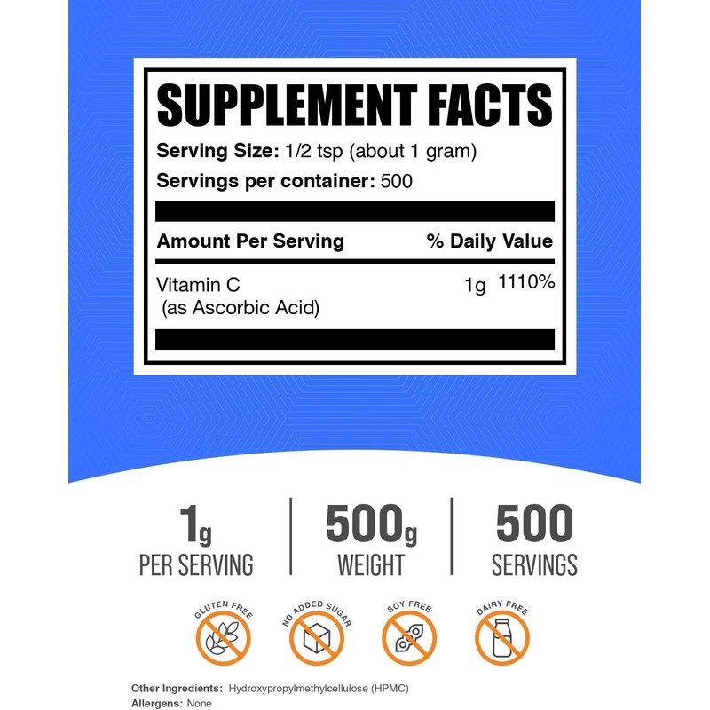 BulkSupplements.com Ascorbic Acid Powder - Vitamin C Supplement, for Immune Support - Ascorbic Acid Food Grade, Gluten Free, 1g per Serving, 500g (1.1 lbs) (Pack of 1)