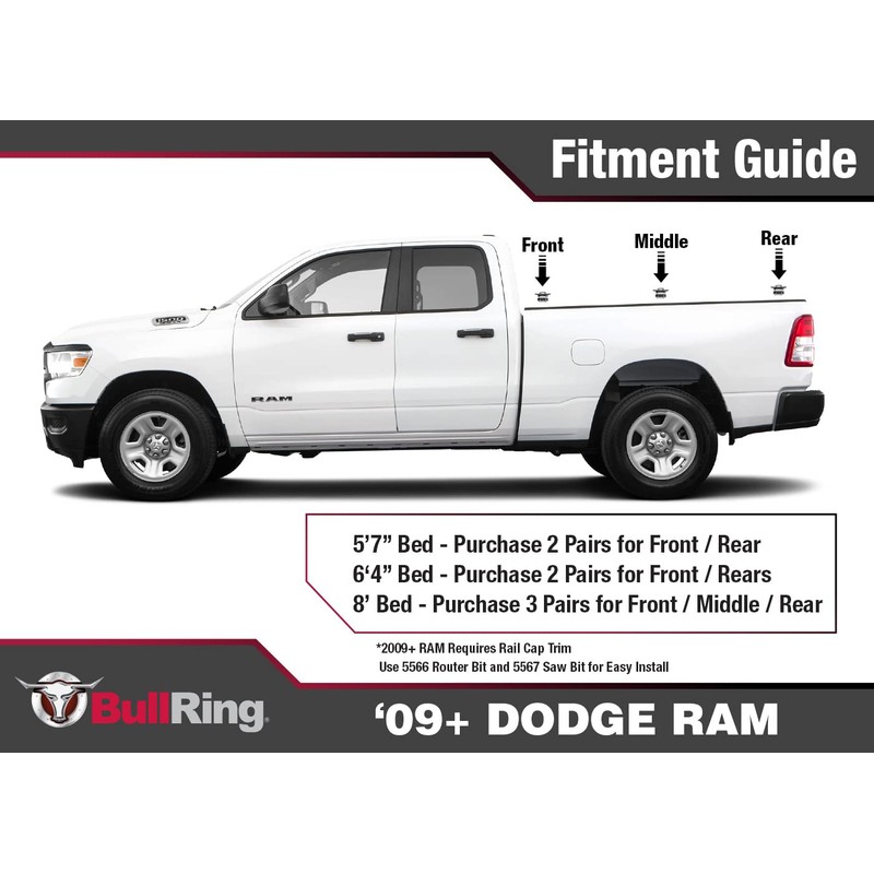 - FITMENT GUIDE: Built for '95-'21 Dodge RAM 1500, 2500 & 3500, '14-'19 Toyota Tundra CrewMax. Requires rail cap modification. **Not compatible with 09+ RAM Dually** For 5’5”- 6’5” bed purchase 2 pairs for front/rear. For 8’+ bed purchase 3 pairs for front/middle/rear.