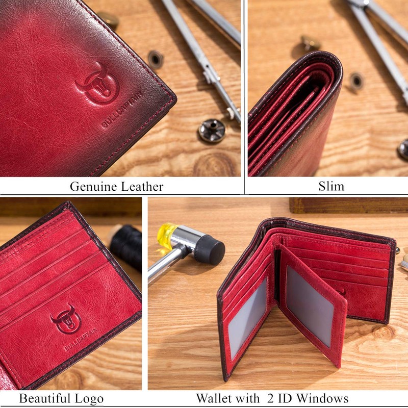 BULLCAPTAIN RFID Wallets for Men Slim Bifold Genuine Leather Front Pocket Wallet with 2 ID Windows QB-05(Crimson )