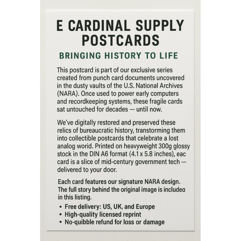 This postcard is part of our exclusive series created from punch card documents uncovered in the dusty vaults of the U.S. National Archives (NARA). Once used to power early computers and recordkeeping systems, these fragile cards sat untouched for decades — until now.