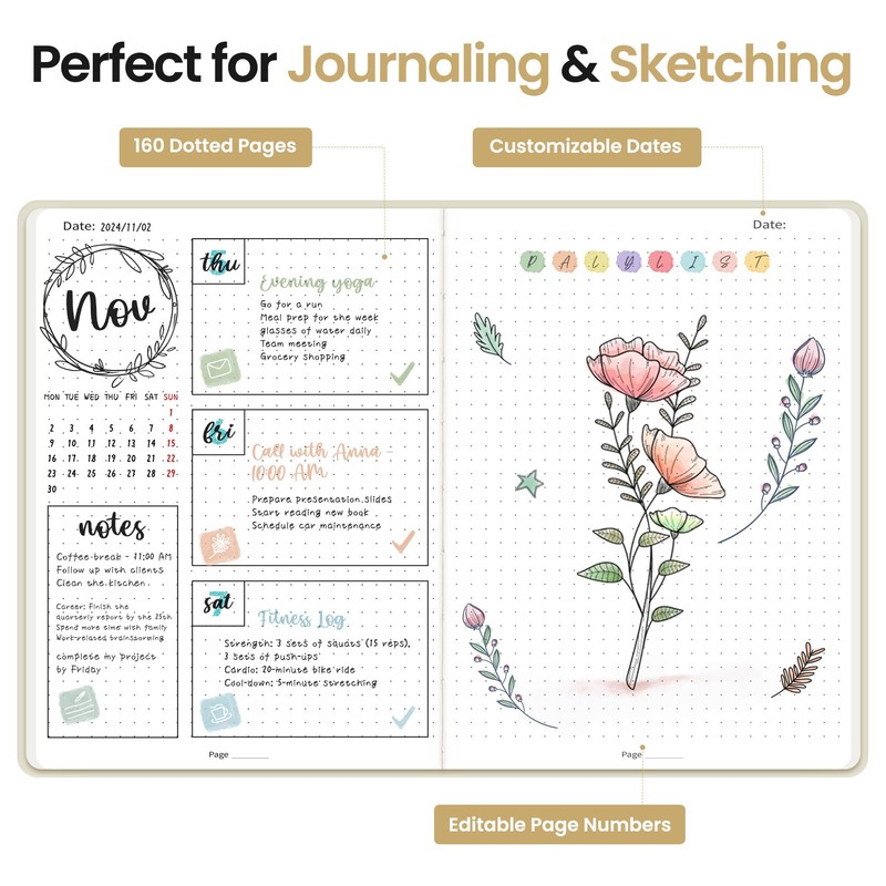 - 160 Pages Dotted Journal: Discover the freedom of 5mm-spaced dotted pages, perfect for bullet journaling, sketching, and organizing. The subtle dot grid provides structure without limiting creativity, helping you easily design layouts, track goals, and develop ideas in your personal style.