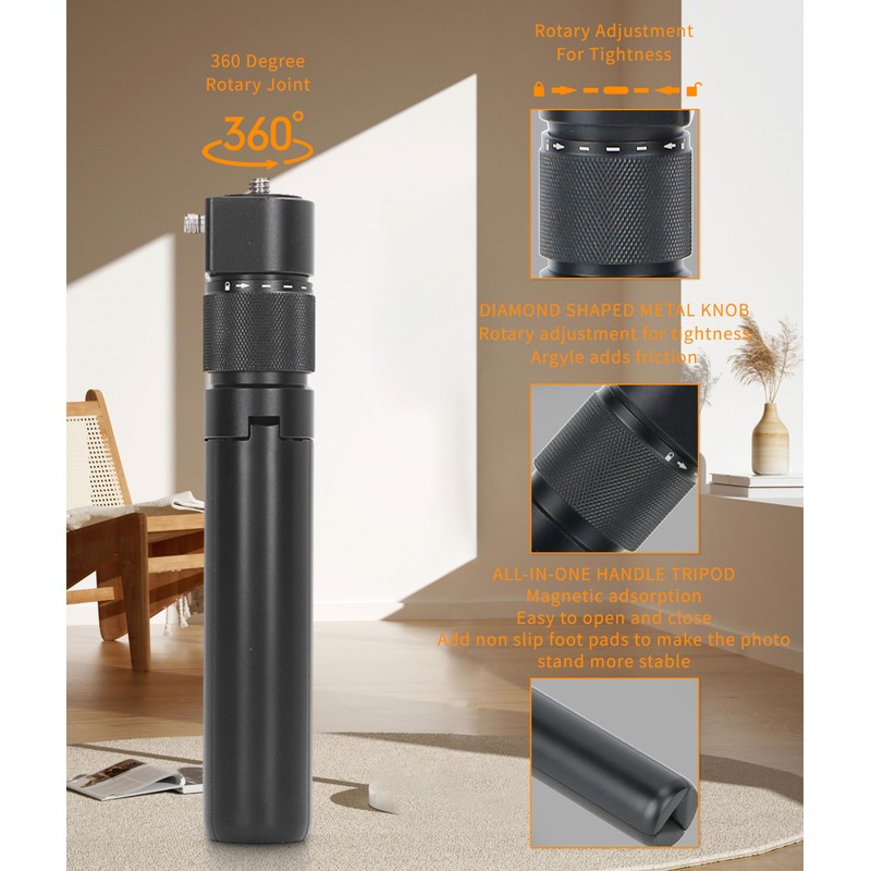 • 1/4 SCREW INTERFACE:The handle can also be turned into a tripod to be deployed on the ground, or assembled on a selfie stick as a handle to shoot bullet time videos, the 1/4 inch set screw interface enables it to connect directly to a camera.
