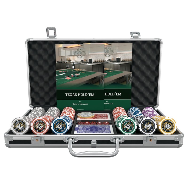 The Bullets Playing Cards poker case is a complete set for an enhanced gaming experience, perfect for both poker enthusiasts and beginners. Also included are a ceramic dealer button, two decks of Bullets plastic poker cards, 5 dice, and poker rules. The chips have a diameter of 4 cm. This set is an ideal gift for any casual gathering or recreational social event.