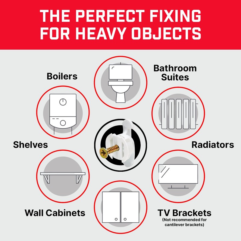 - Strong and Reliable - Thanks to its patented design with wings that open in the plasterboard cavity, the heavy-duty plasterboard fixings can hold up to 116kg (see datasheet) on any plasterboard walls of standard thickness (12.5mm - 16mm).
