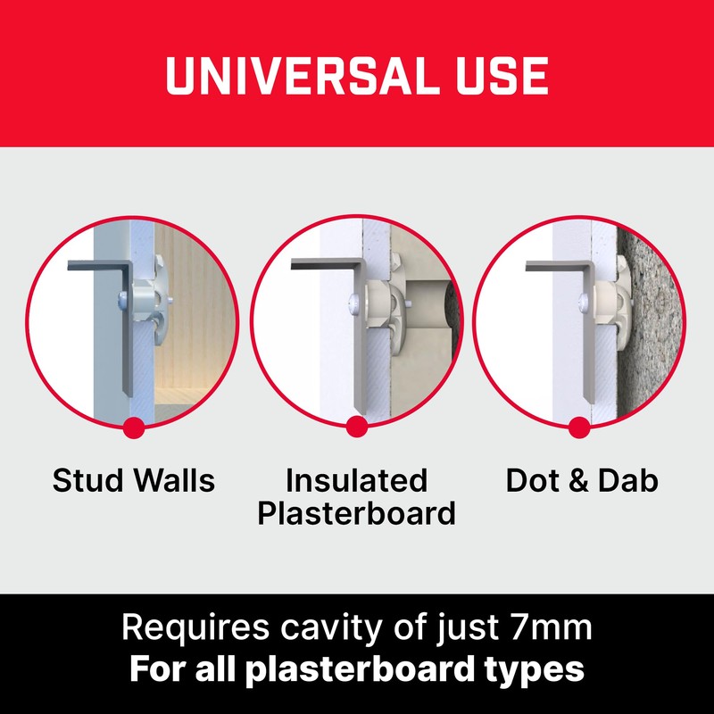 - Universal Use – Fixings are versatile and can be used on any plasterboard fitting type such as Dot & Dab (Only 7mm cavity is required), Stud Walls and even Insulated Plasterboard