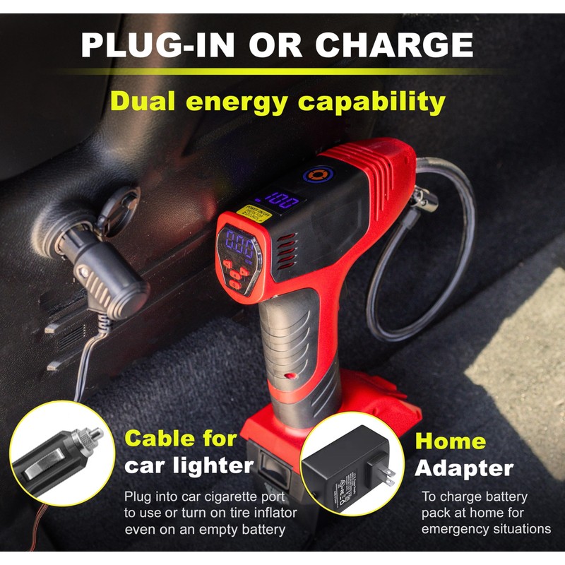 • Pre-set Function w/ Auto Shut Off – set desired ressure and this car tire inflator automatically shuts off once value or target tire pressure is reached. Easy to read LED screen displays tire pressure and battery level, and user-friendly increase/decrease buttons make calibration both easy and accurate.