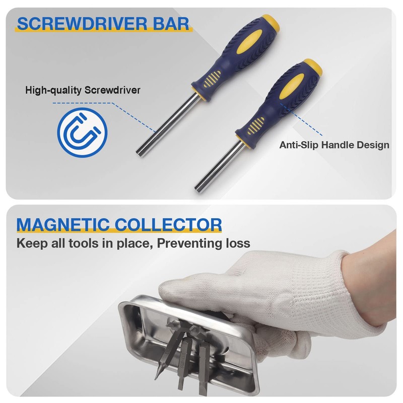 - 【PROFESSIONAL SCREWDRIVER SET】: Including 84×Screwdriver Bits; 9×Roll Pin Punch; 2×Screwdriver Bar; 2×Hammer Head; 1×Hammer; 1×Hex-to-square Drive Adapter; 1×3” Shaft Extension; 1×magnetic parts tray. Meets all your work needs.