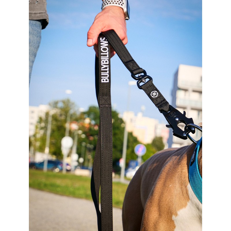 Are you looking for a lead that is not only has a padded handle for a more enjoyable walk, has an anti-tangle mechanism to avoid your dog tangling the lead during walks, has been pressure tested to withstand hundreds of pounds of pressure and a bespoke clip that is so easy to lock and release onto any collar or harness?You are in the right place. This is undoubtably the most popular BullyBillows lead we currently offer.Trademark & Copyrighted Design Rights Number:6189800The length of this lead is 1.4 metres from top to bottom and the width is 3cm/1.2", ensuring your dog is close enough at all times during a walk but long enough to allow your dog a bit of space whilst walking.We have also lined the inside of the lead and the handle with Neoprene, which is the same material used on wet suits which is soft, quick drying and odourless.