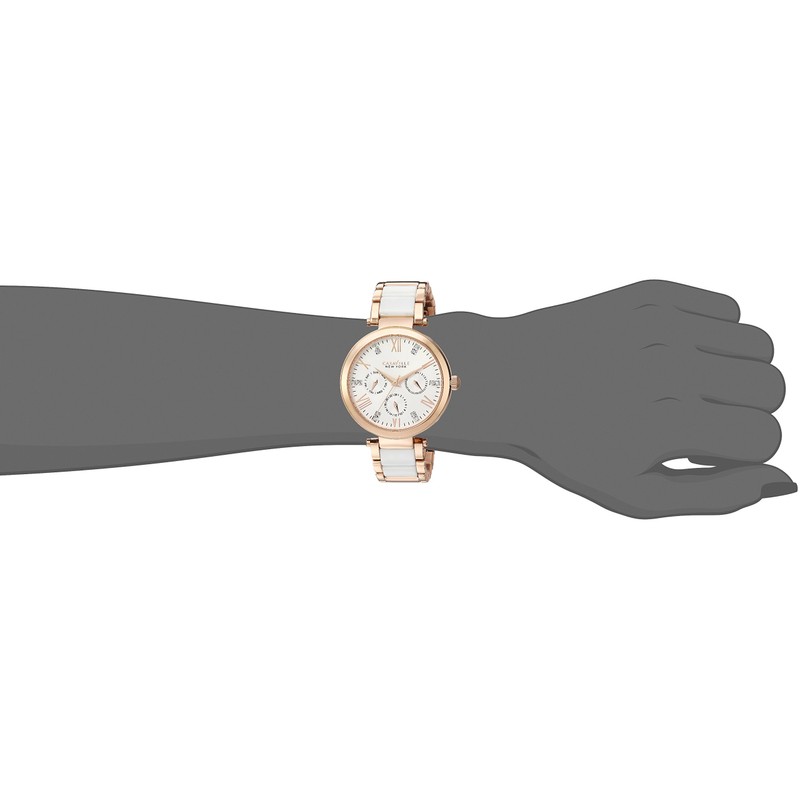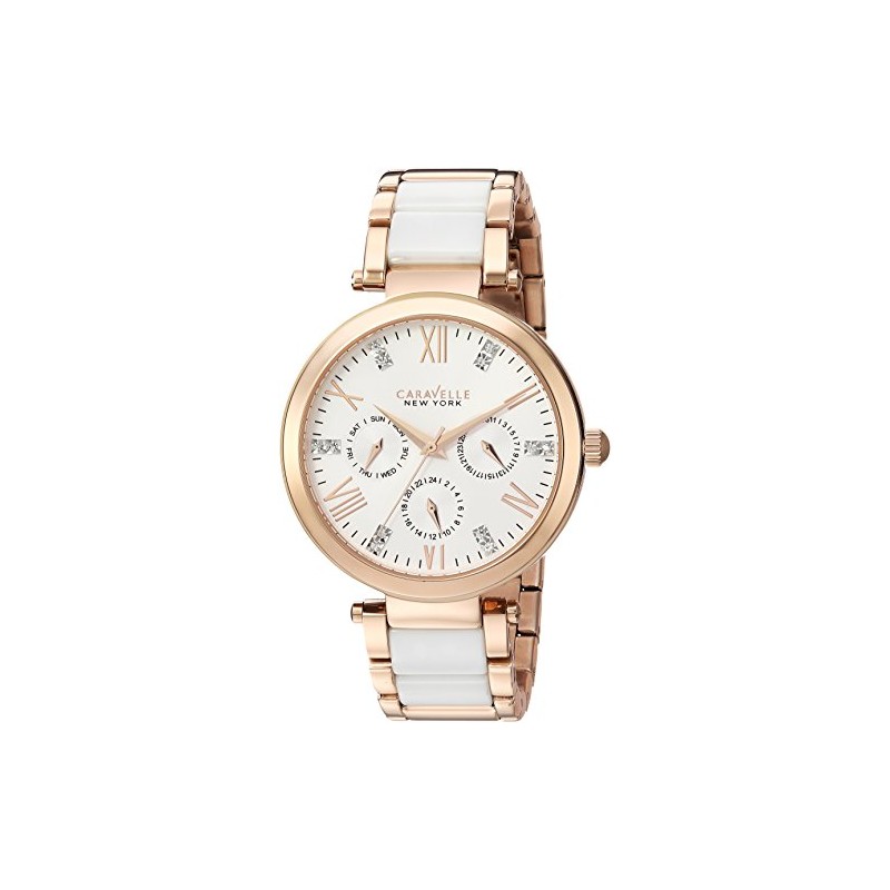 - Silver-white dial with rose gold-tone and crystal accents. Multifunction day, date and 24-hour sub dials. Rose gold-tone stainless steel case