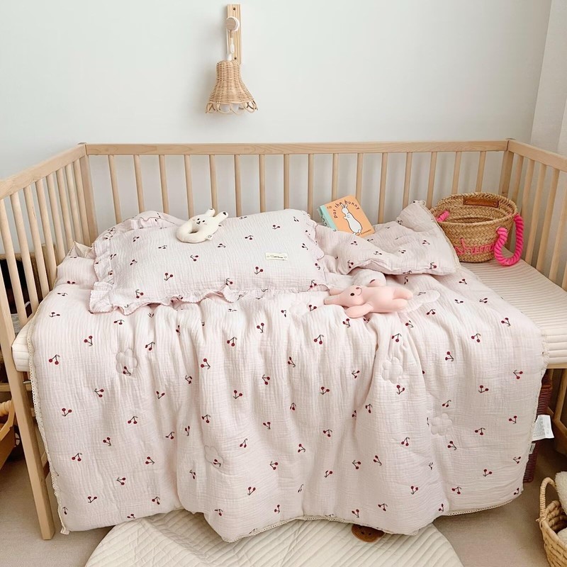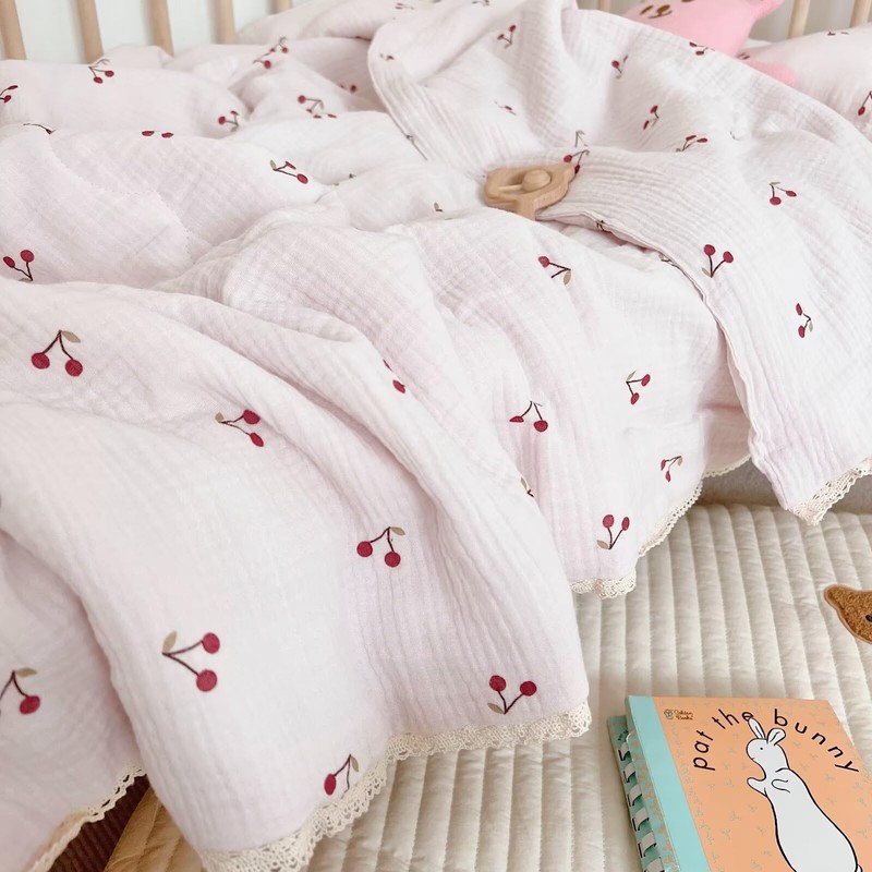 - đăCute PatternăCotton muslin crib quilt features red cherry fruit print on beige color blankets that your sweet little one will love. Great for kids room decor, special gift for kids,baby girl/boy,toddlers,children. This delightful muslin nursery blanket will give your baby crib an instant update, infusing adorable vintage charm into the nursery.