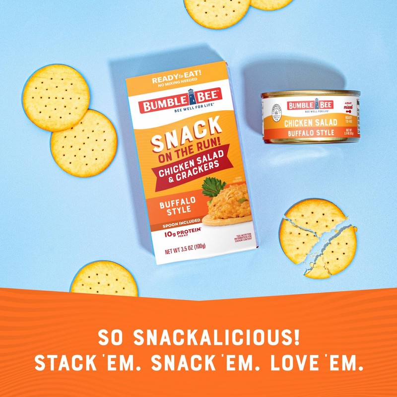 - DELICIOUS CHICKEN SNACK WITH CRACKERS: Pack of 12, 3.5 ounce Bumble Bee Snack on the Run! Buffalo Style Chicken Salad with Crackers Kit will satisfy you and your family whenever you want a tasty snack or quick lunch on the go