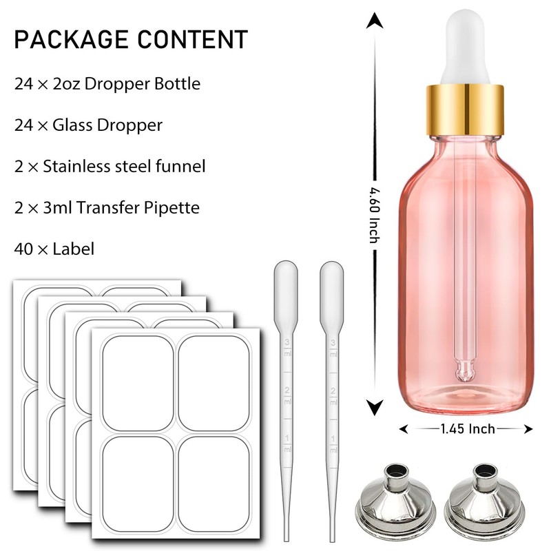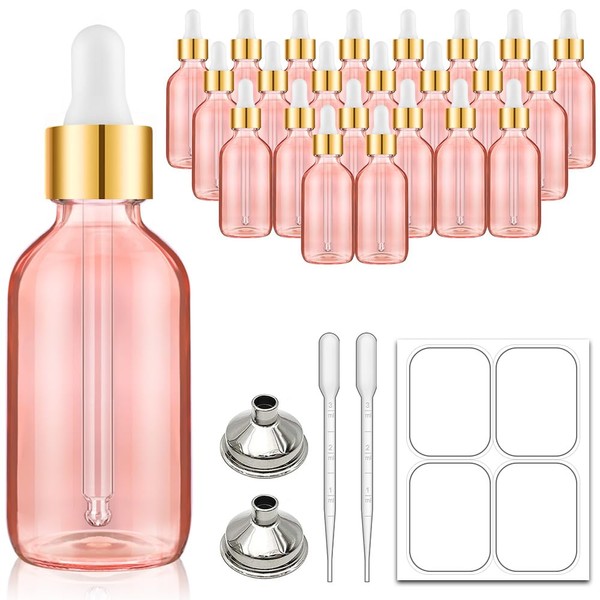 Bumobum 2 oz Dropper Bottle, 24 Pack Pink Glass Eye Dropper Bottles with Golden Top Cap for Essential Oils, Tincture Bottle with Labels and Funnel