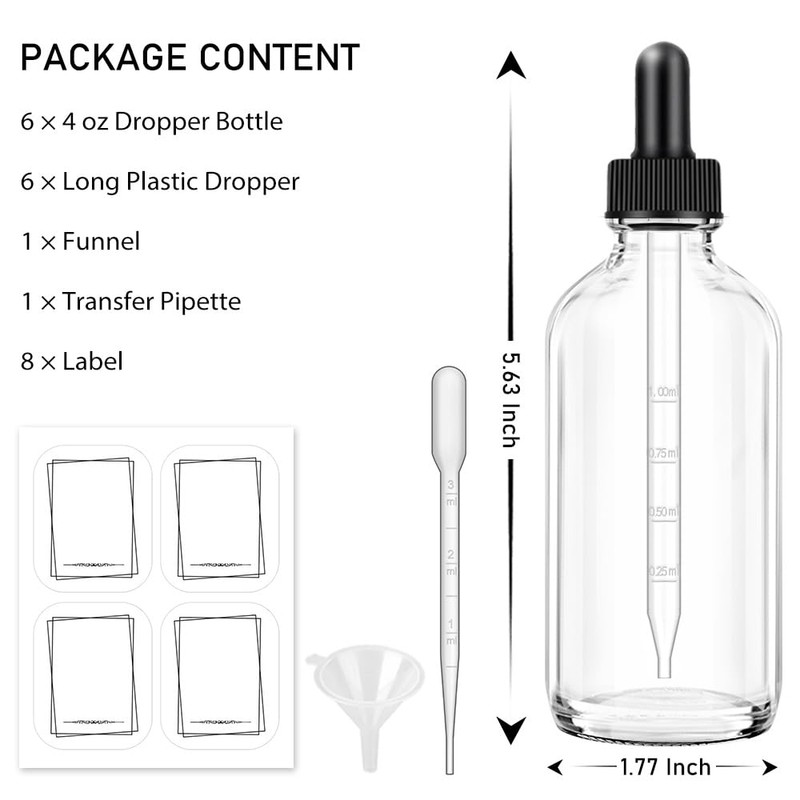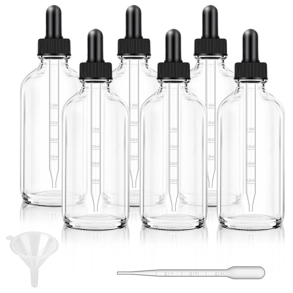 Bumobum 6 Pack, 4 oz Dropper Bottle with Measured, Clear Glass Eye Dropper Bottle for Essential Oils with Funnel, Labels & Pipette(Unbreakable Plastic Measured)