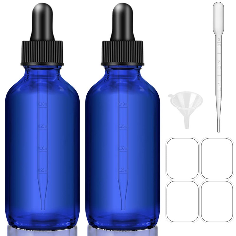 Bumobum Dropper Bottles, 4oz Blue Bottle with Dropper for Essential Oils with Funnel, Labels & Pipette, 2-Pack Tincture Bottles with Dropper(Unbreakable Plastic Eye Dropper)