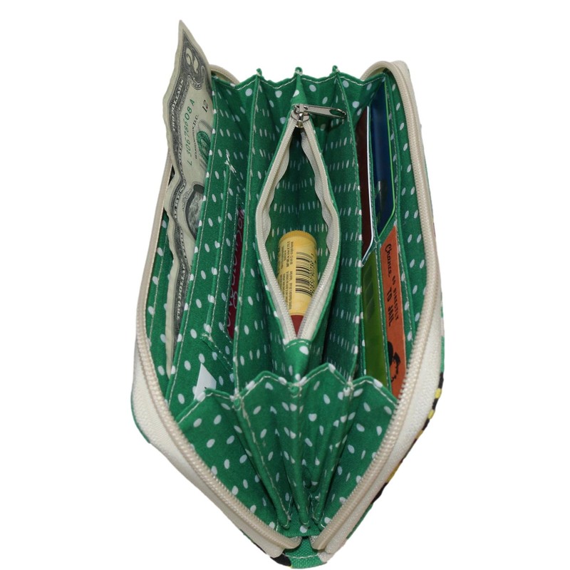 Trust the Bungalow360 zip-around wallet to secure your valuables! Features a zipper closure with their signature peace sign pull. Opens to six accordion pockets, a windowed ID slot, four card slots and a center zippered coin pouch. As always, the wallet features coordinating polka-dot lining. Made of heavy natural cotton canvas and printed with water-based inks. Bungalow360 creates eco-friendly accessories for the environmentally responsible fashionista!