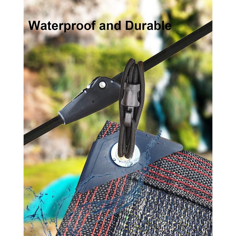 - Short Tarpaulin Hooks Installing: Using tarp clips to hold the tent in place. Elastic bungee straps can be easily pulled through the grommet and support, then lock it on the hook. And you can loop multiple small bungees together to make extra lengths.