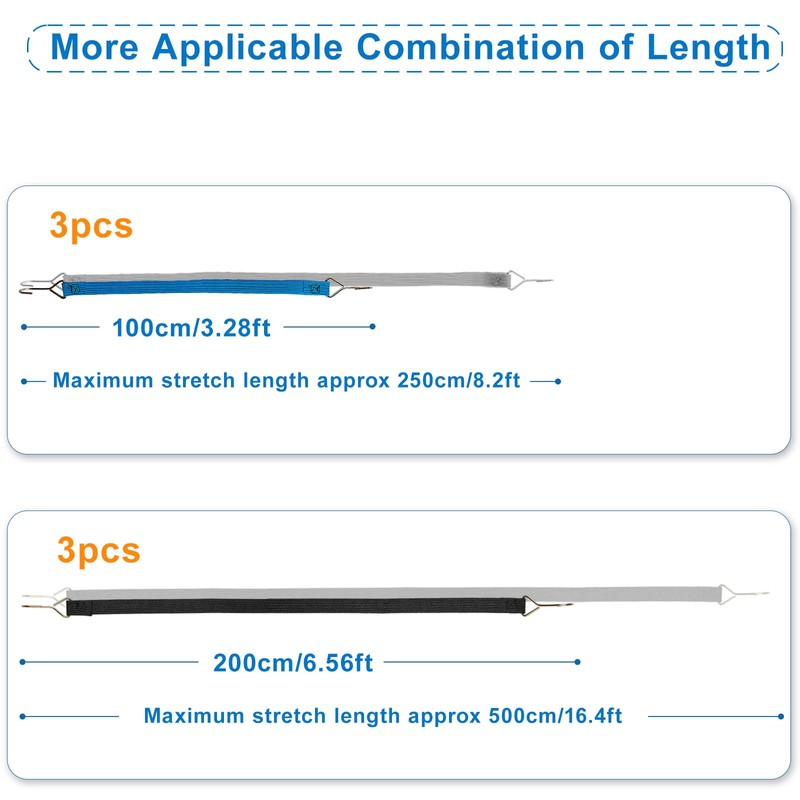- [More applicable combination of length] this is a unique blue and black set combination different from other similar products, including thickened and flat elastic rope (3PCS*100CM(blue)+3PCS*200CM(black). It adopts high elastic viscose yarn with stronger resilience, the maximum stretching length exceeds 2.5 times.