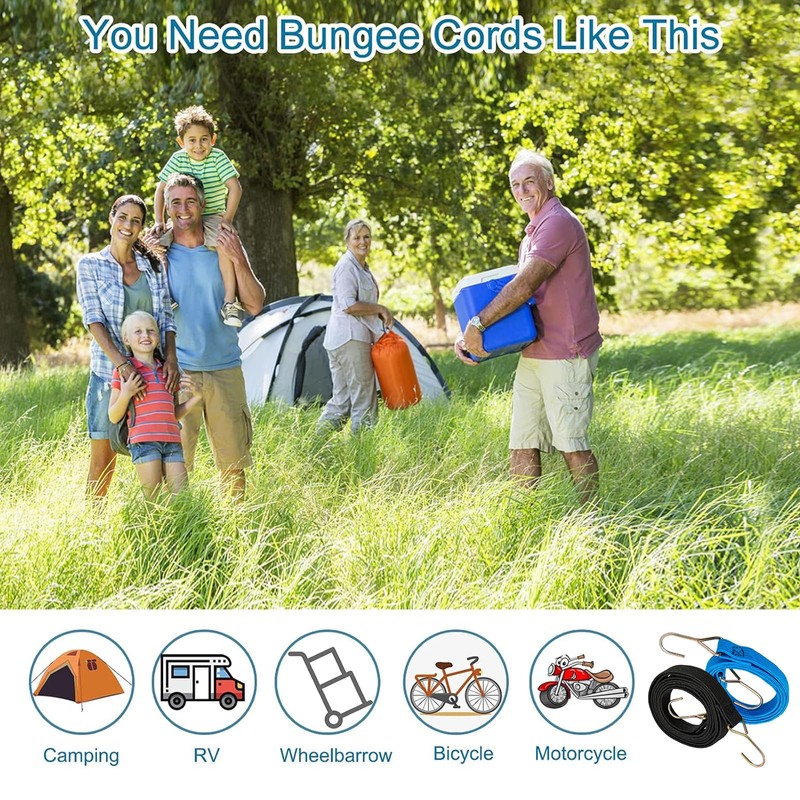 - Wide Applications - The two types of elastic ropes of different dimensions could combine more effectively as per your actual needs. Not only could they be used for fixing the luggage on the bicycle, motorcycle, or automobile, but also for moving cases, camping or hanging clothing, and so on. In addition, partition could also be taken as another function for collecting the automobile trunk or tools, toys, and articles for daily use at home, etc.also ideal for Outdoor use to secure camps, tents, tarps, canopies, tie down branches and trees.