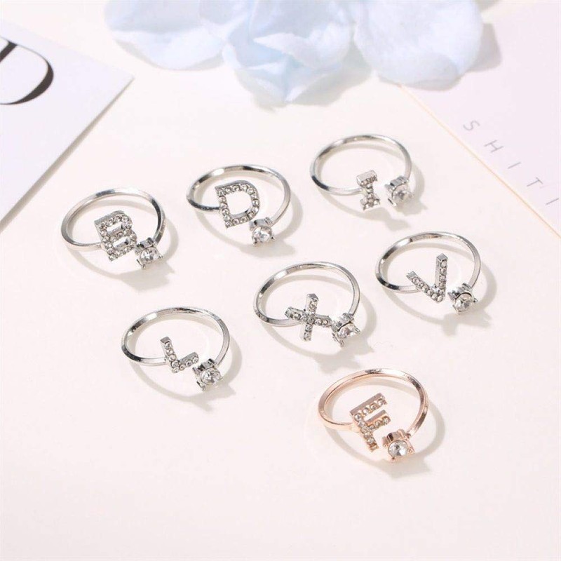 • Size: 10 mm (letter). Width: 10 mm (letter). Colour: Silver studded with clear cubic zirconia crystal stones. Customisable letters: A B C D E F G H I J K L M N O P Q R S T U V W X Y Z. The whole alphabet is available. Delivery contents: 1 letter ring + organza bag