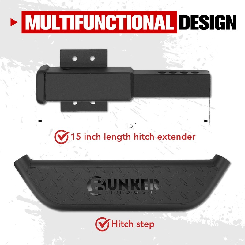 - MULTIFUNCTIONAL DESIGN: With hitch steps,it is convenient for you get on and off.Also you can use it as a 15 inch length hitch extender.Besides,as rear bumper step, it can provide maximum protection for your vehicle from rear end collisions
