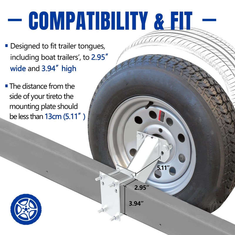 - Compatibility & Fit: This trailer spare tire carrier is designed to fit trailer tongues, including boat trailers’, to 2.95″wide and 3.94″ high, and is further upgraded to hold 4-lug and 5-lug wheels with 3.94″, 4″, 4.25″ and 4.72″ bolt patterns.