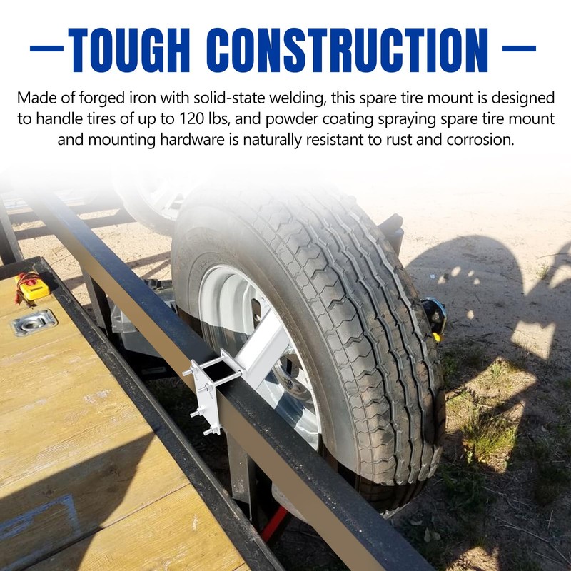 - Made of forged iron with solid-state welding, this spare tire mount is designed to handle tires of up to 120 lbs, and powder coating spraying spare tire mount and mounting hardware is naturally resistant to rust and corrosion.