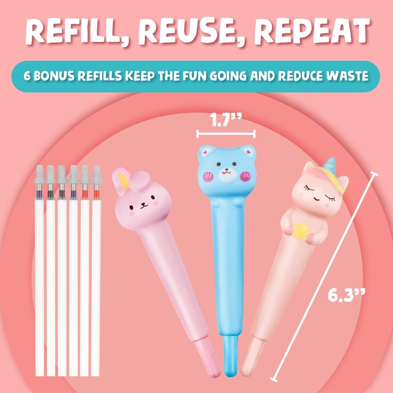 - 6 Ink Refills - These fun pens for kids include 6 ink refills (2 black, 2 blue, and 2 red), while the charming unicorn, bunny, and bear characters inspire smiles with every use!