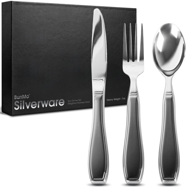 BunMo Weighted Utensils for Tremors and Parkinsons Patients - Heavy Weight Silverware Set of Knife, Fork and Spoon - Adaptive Eating Flatware (3 Pieces)