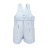Crisp and clean blue striped seersucker shortalls with a touch of blue gingham trim and button closure.