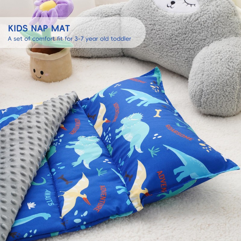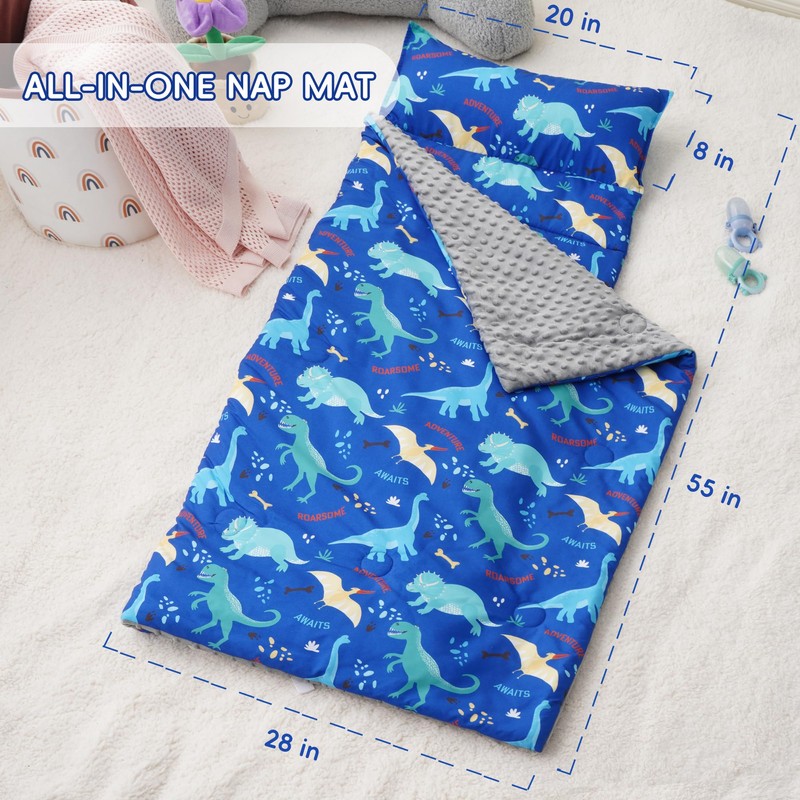 - Designed for Toddlers: Nap mat measures 55" x 20", blanket measures 47" x 28", perfect for ages 2-5. The soft, smooth lining is more skin-friendly and breathable.The cute designs of dinosaurs, unicorns, and more that toddlers will love