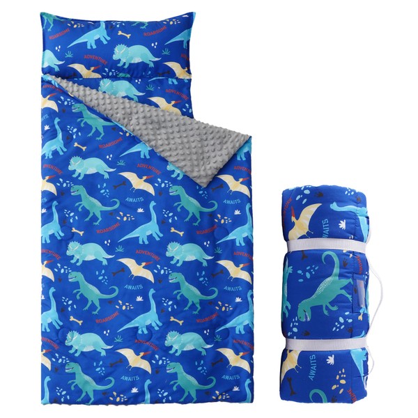 Bunnikins & Clover Toddler Nap Mat with Removable Pillow, Nap Mats for Preschool, Easy Clean Toddler Nap Pad for Kindergarten, Kids Sleeping Bag for Travel Camping (Dinosaur Blue)