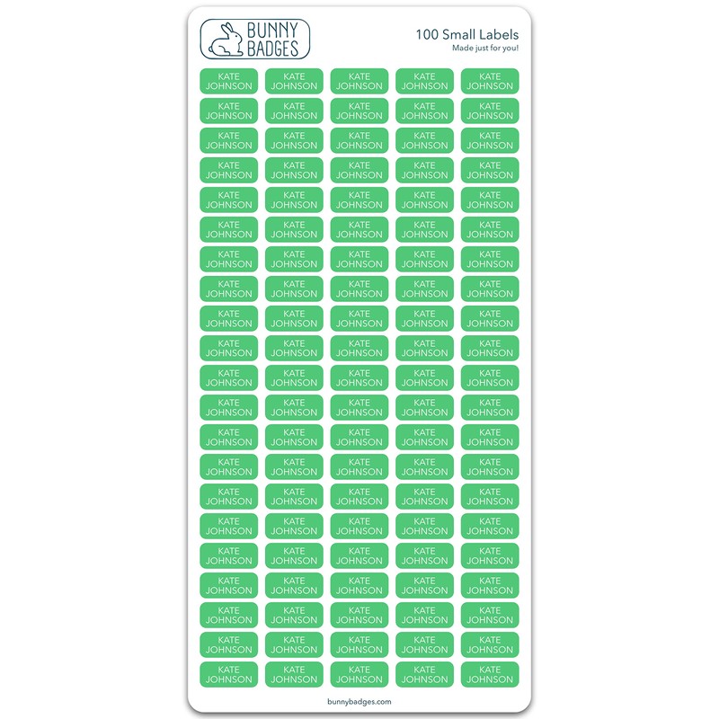 Bunny Badges Personalized Name Labels (100 Labels) (0.9" 0.4") Small Custom Name Stickers - Waterproof Name Labels for Kids, Toddlers and Parents