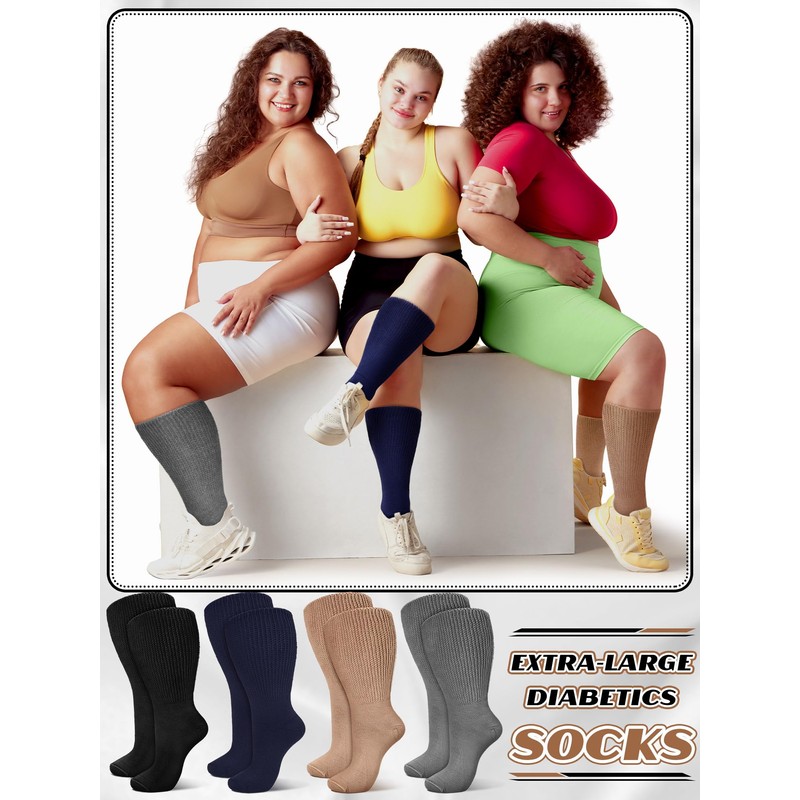 Bunnycool 4 Pairs Extra Wide Socks Swollen 30" Lymphedema Socks Bariatric Socks Non Binding Socks(10-13,Dark Blue,Gray,Black,Beige)