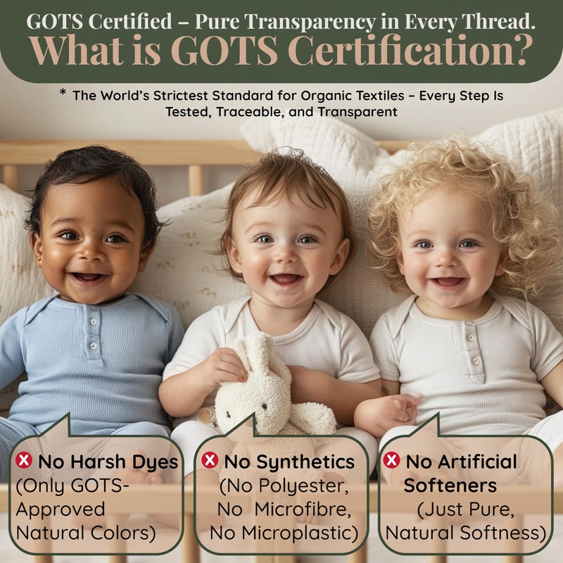 - ✅ CERTIFIED ORGANIC COTTON – PURE FROM FARM TO FINISH: Only GOTS-certified organic cotton, tested at every stage for harmful substances. No pesticides. no heavy metals, No synthetic fibers. No harsh dyes. Certified by Control Union (License No: 1139680), Because nothing else should touch a newborn’s skin.
