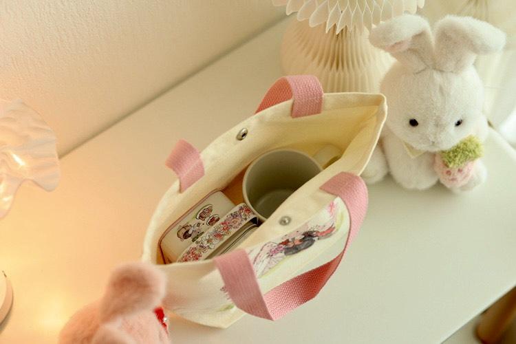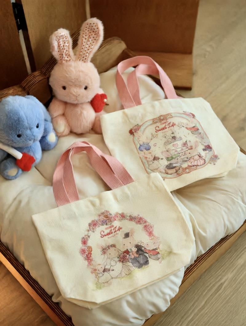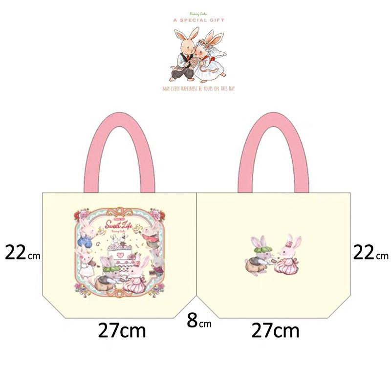This canvas tote bag is a special design by Bunnylulu. There are multiple color options. This is mini size, which is perfect for Bunnylulu bunny pompom keychain and other gifts.