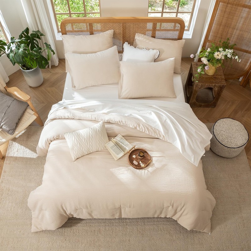 BUPIRD 3 Pieces Beige King Comforter Set, Lightweight Double-Layer Crinkle Gauze All Season Soft Bedding (90x104 in Comforter & 2 Pillowcases)