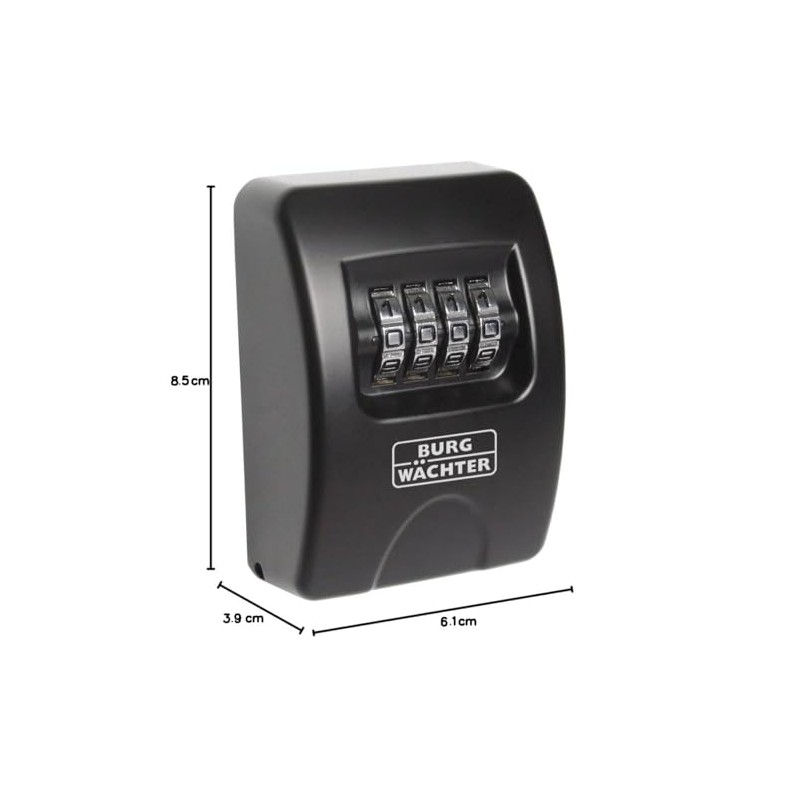 - Box contents and dimensions: 1 BURG-WÄCHTER key safe 10 SB with combination lock, mounting material, material: die-cast zinc, dimensions: (H x W x D): 85 x 61 x 39 mm, colour: black