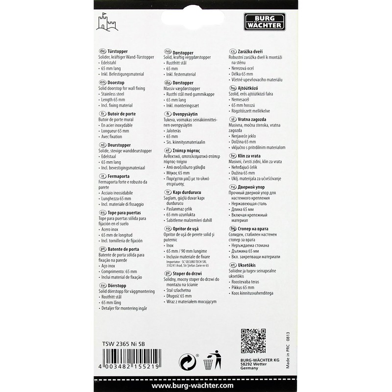 - Box contents: 1 Burg Wächter TSW 2365 Ni SB wall door stop, including mounting material, dimensions (H x Ø): 65 x 51 mm, material: stainless steel/rubber