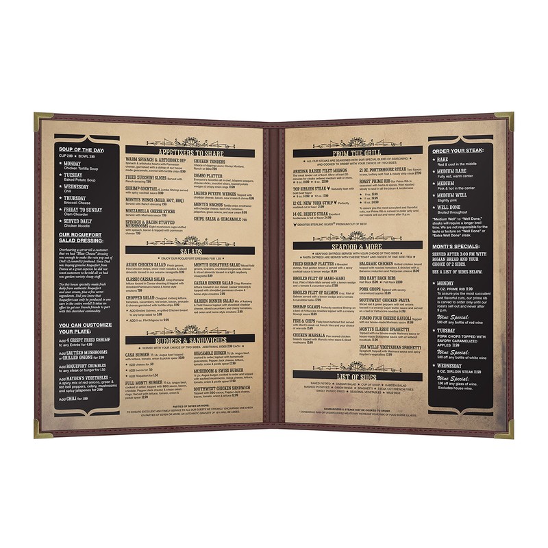 - PAGE COUNT/VIEWS: One Page/One View, Two Pages/Two Views, Three Pages/Four Views; One Page/One View: Ideal for compact layouts with all information at a glance, perfect for drink lists or daily specials. Two Pages/Two Views: A simple front-and-back format, great for standard food or beverage menus. Three Pages/Four Views: Perfect for extensive menus with a tri-fold or multi-panel layout, ideal for detailed descriptions, promotions, or multiple categories like appetizers, entrees, and desserts.
