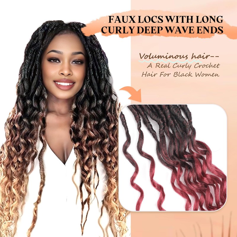 - 【Specification Lengths, Colors for YOUR Curly Faux Locs Hair Style】 Deep Faux Locs Crochet Hair 18",12strands/pack,8packs/deal,96strands totally.multiple length: 12", 14", 18", 24" or 30" lengths—all with lightweight, fluffy volume.Rich colors:we got classics like 1B#, fun fades like OT1B/27#, and edgy mixes like TBUG# etc. 6-8 packs do the trick full head—Whether you want subtle everyday waves or bold, show-stopping curls, there’s a choice for you.
