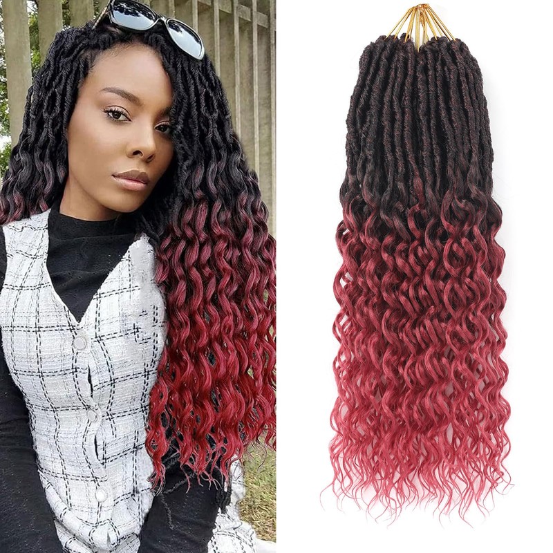Burgundy Pre-Looped Goddess Locs Crochet Hair for Black Women-8 Packs 18 Inch Faux Locs With Deep Wave Curly Ends Soft Synthetic Prelooped Loose Wavy Braids|Lightweight& Natural Look(18",T1B/BUG#)