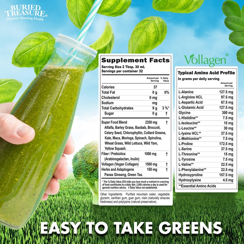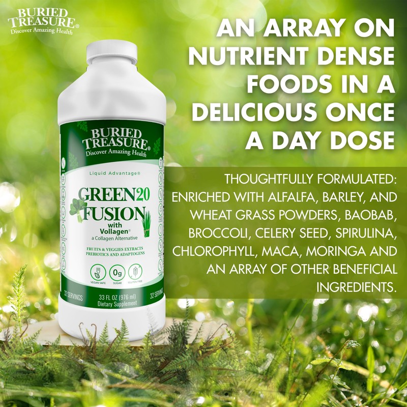 Buried Treasure Green20 Fusion - Ready-to-Drink Green Superfood with Spirulina, Kale, and Panax Ginseng - Supports Energy, Immunity, and Digestive Health - Vegan, Non-GMO, Gluten-Free, 32 Servings