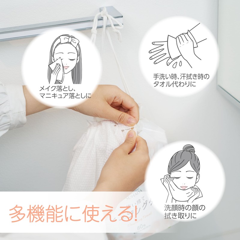 It is easy to wipe off your face and part of your body, making it ideal for emergencies. This is a discontinued type. Embossed detailing makes it easy to wipe away dirt. It is durable and recommended for cleaning. A new habit for beautiful skin. After washing your face, use a cleansing towel instead of a towel. Wiping off with a cleanser towel reduces friction on the skin and keeps skin clean. Not only can you wipe off your face after washing, but it can also be used as a substitute for washing sweat. No fluorescent paints or drifting agents. Rolls type so you can cut it to your desired length. You can hang it on a towel and use it without getting wet. It is even easier to use by wrapping the string of the package to hang the towel in the washing area. Packaging may be changed.