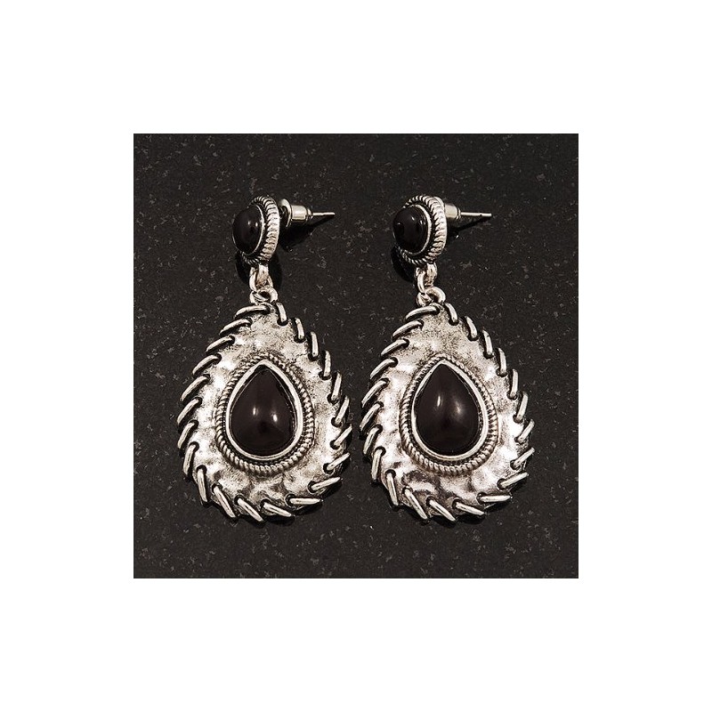 Burn Silver Teardrop Black Resin Stone Drop Earrings - 5cm Length