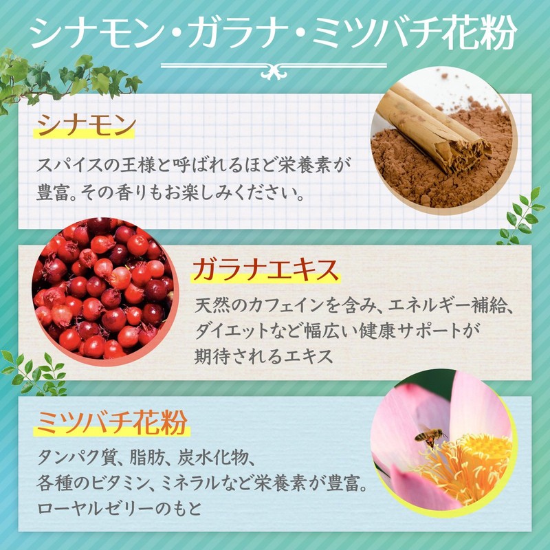 • Main ingredients: Guarana seed extract, honeybee pollen, cinnamon, malic acid, magnesium, etc