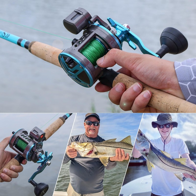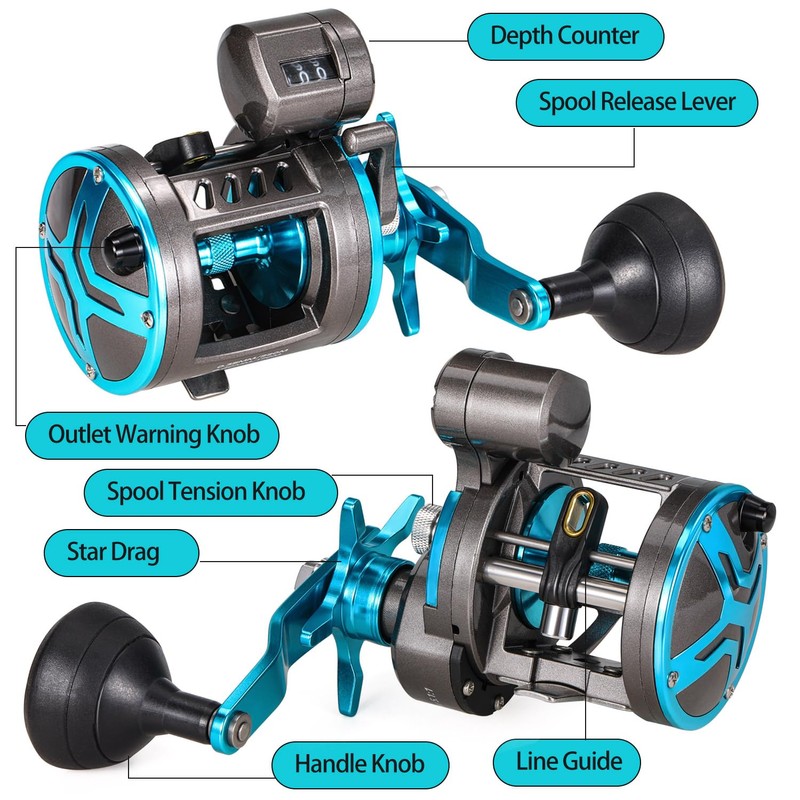 - LINE COUNTER TROLLING REEL – The line counter reels feature a mechanical line counter function that measures in feet. 3 double shielded, stainless-steel ball bearings plus an instant anti-reverse bearing. Precision cut brass gears and stainless steel pinion gear plus machined brass worm shafts and stainless-steel guide shaft make this conventional fishing reel powerful, durable and reliable.