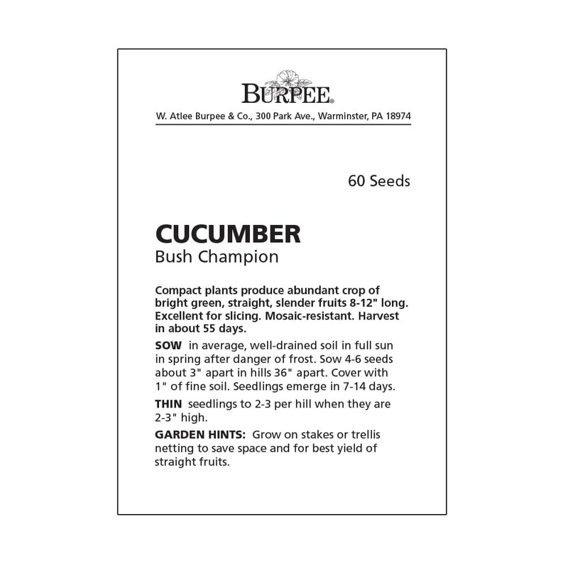 Burpee exclusive. No room for vines? Bush types take one-third the space, so they're great for containers and raised beds. 'Bush Champion's huge 8-12" cukes make this our favorite mini. You won't believe the large number of crisp, bright-green slicers you'll get from the pint-sized plants. Mosaic resistant and productive. Proven tops for productivity, flavor and wide adaptability.