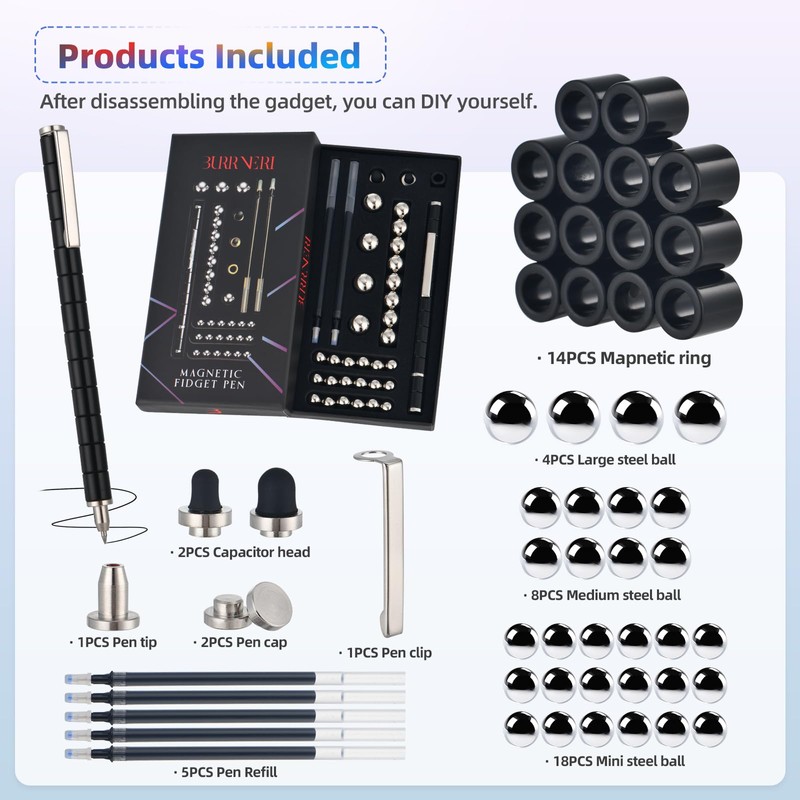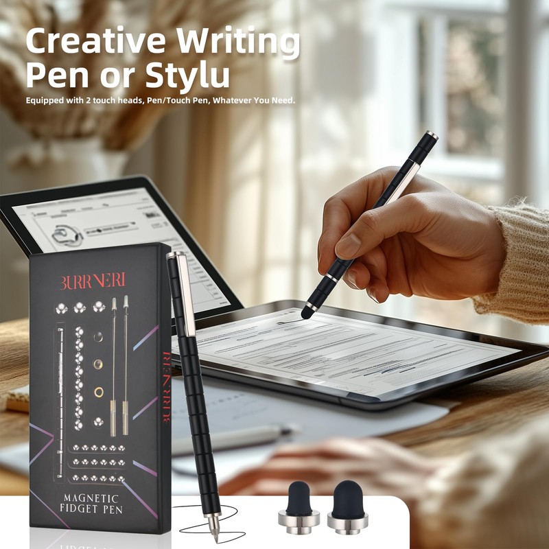 - New & Upgraded Fidget Pen Set - Each case of our fidget pen comes with a complete set of Two Stylus heads, Can be used as a gel pen, touch screen pen, 14pcs magnetic rings, 30pcs steel balls gift box. With touchscreen pen tips included, your fidget magnet pen can be used as a stylus that works on tablets, phones, and any touchscreen surface